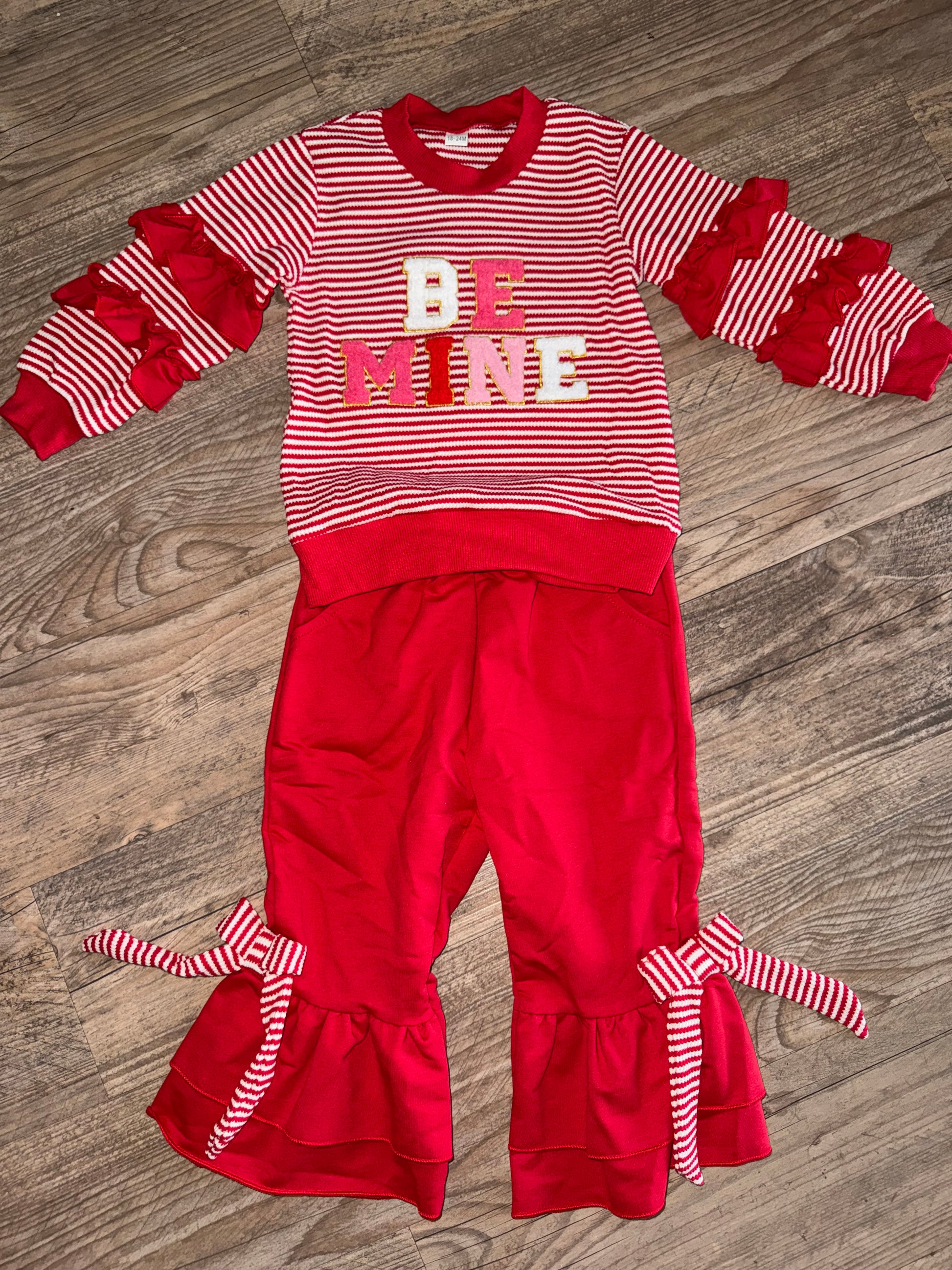 The Be Mine Set features a stylish shirt and pant combination adorned with chenille letters. This set combines comfort and playful design, suitable for casual wear. The use of chenille enhances tactile appeal, while the coordinated style promotes ease of outfit selection for everyday activities.