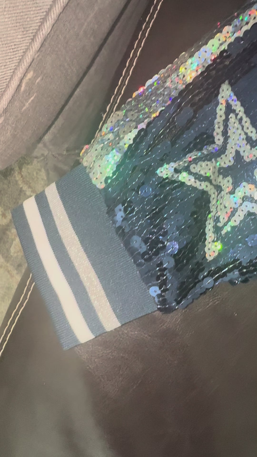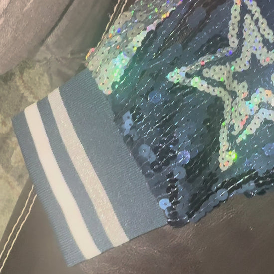This blue and silver star sequin jacket is the perfect addition to any outfit. With its one size fits all design, it can fit a medium when zipped and a large or x-large when unzipped. The varsity straps on the collar and cuff, along with the silver sequin strip on the arm, add a touch of chic style. The blue sequins and silver stars, along with the bold "COWBOYS" on the back, make this jacket a must-have for any fan.